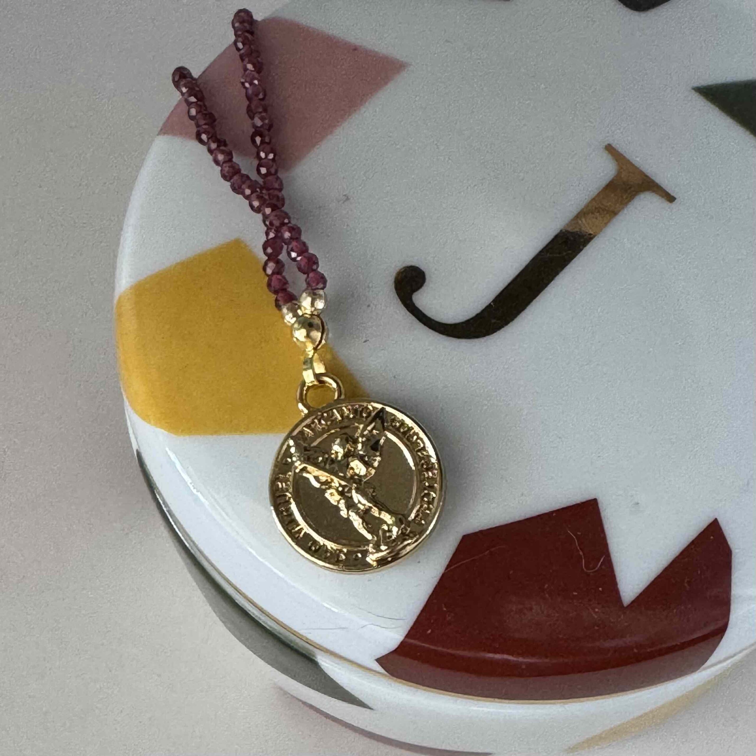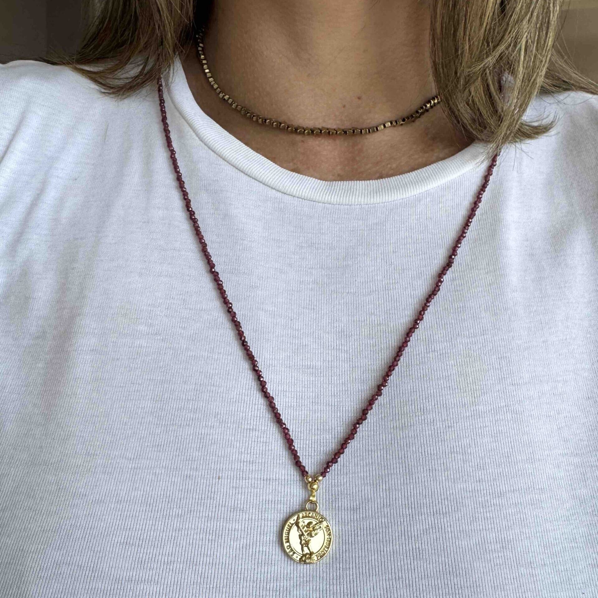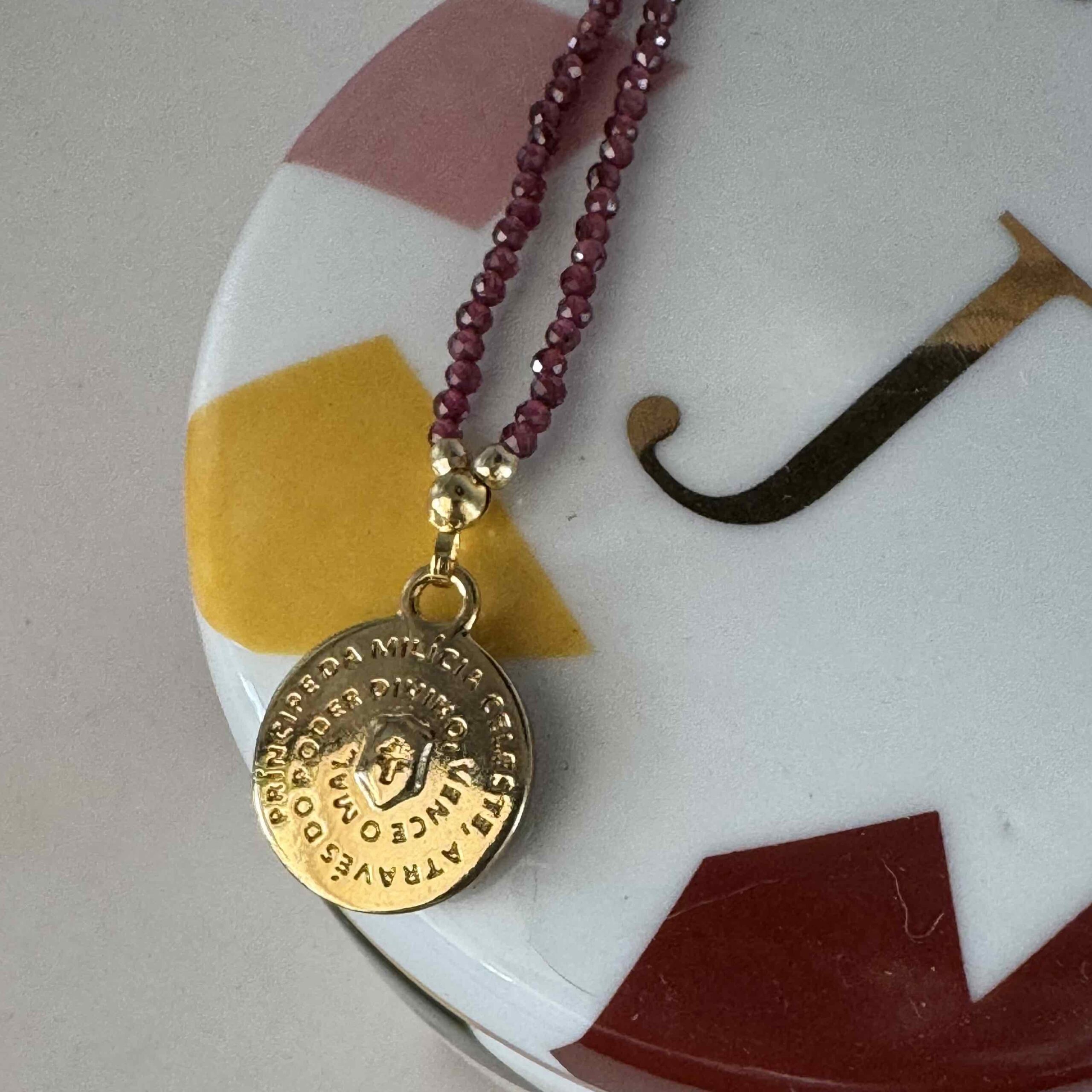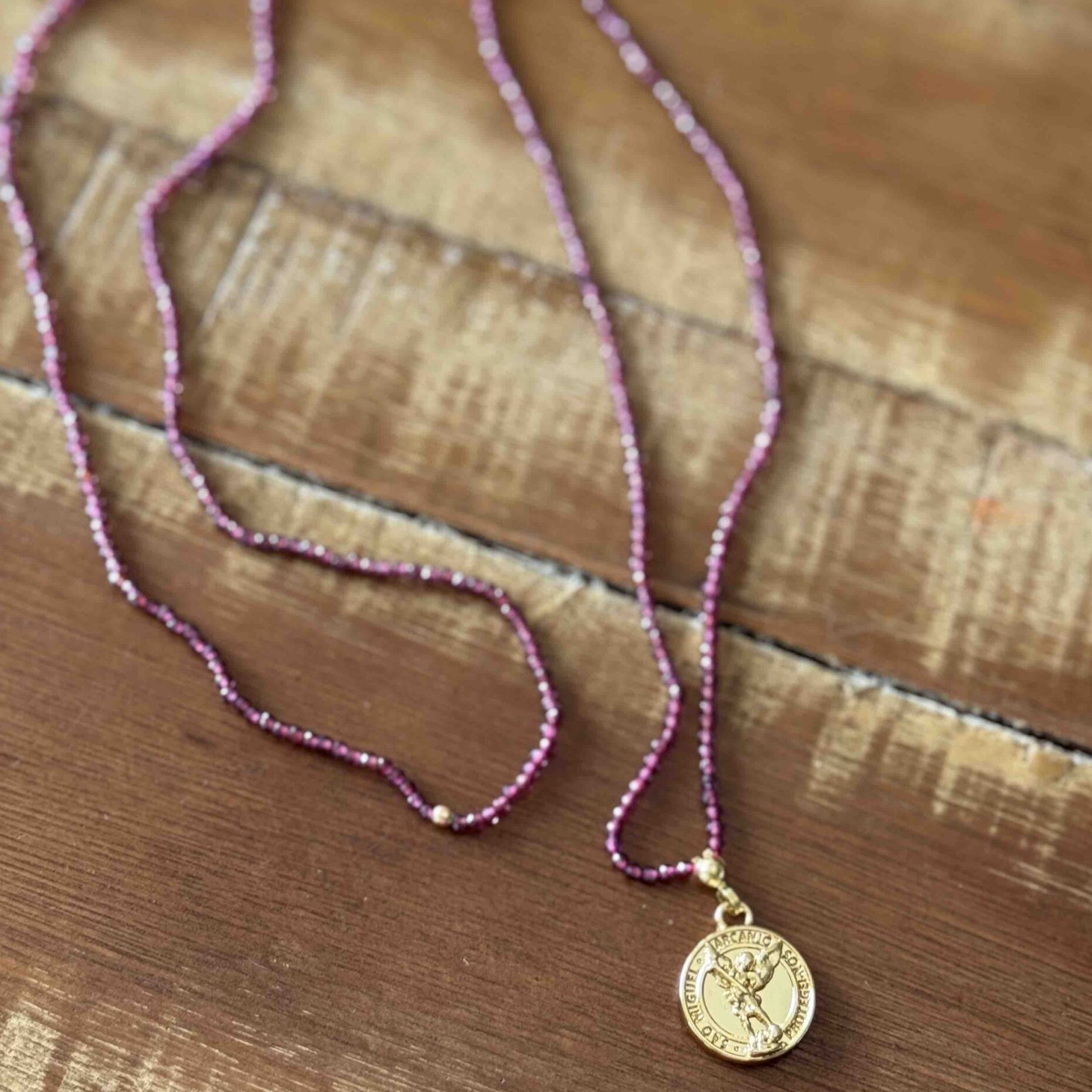 a pedra granada, com sua vibração intensa de coragem e aterramento, e a medalha de São Miguel Arcanjo, um dos maiores símbolos de proteção espiritual que existe.