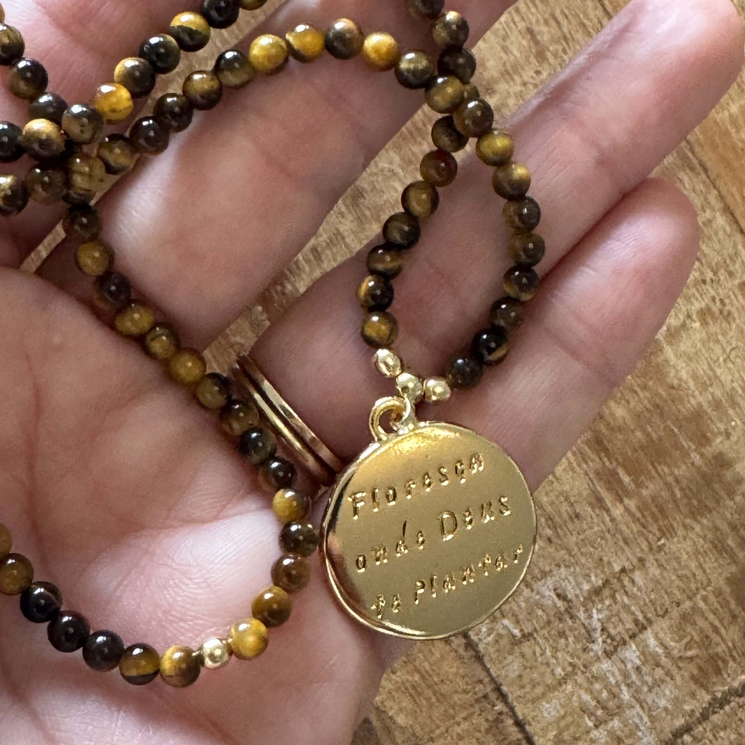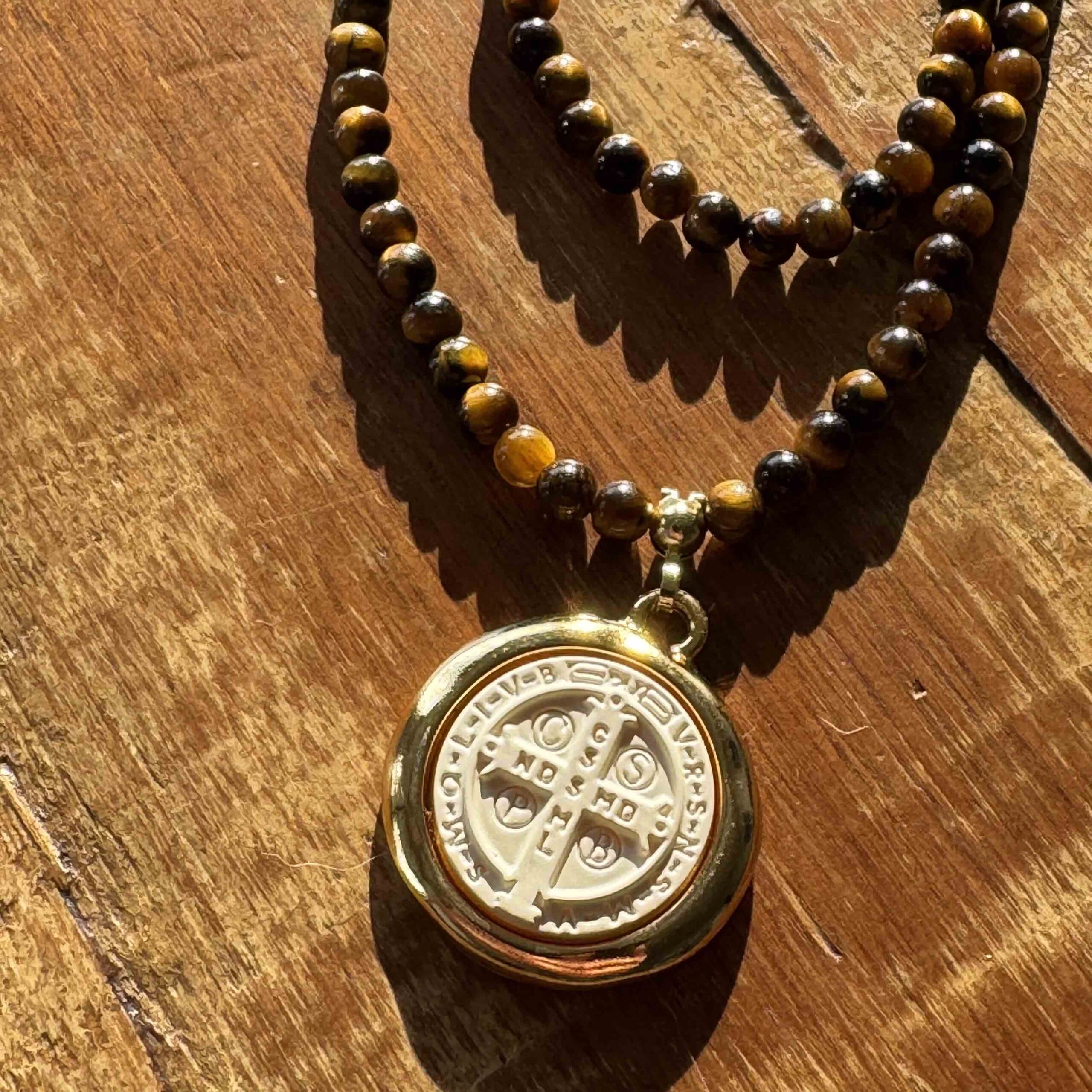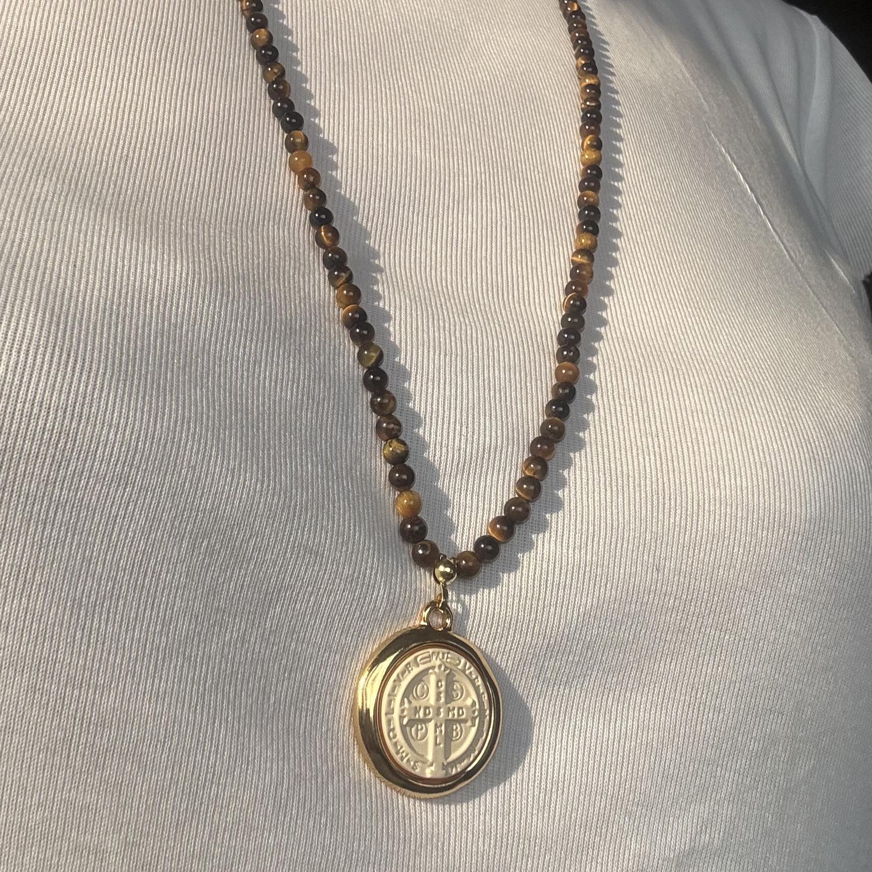 O Colar Proteção une duas forças ancestrais: a energia da pedra natural Olho de Tigre e a espiritualidade da Medalha da Cruz Sagrada de São Bento.