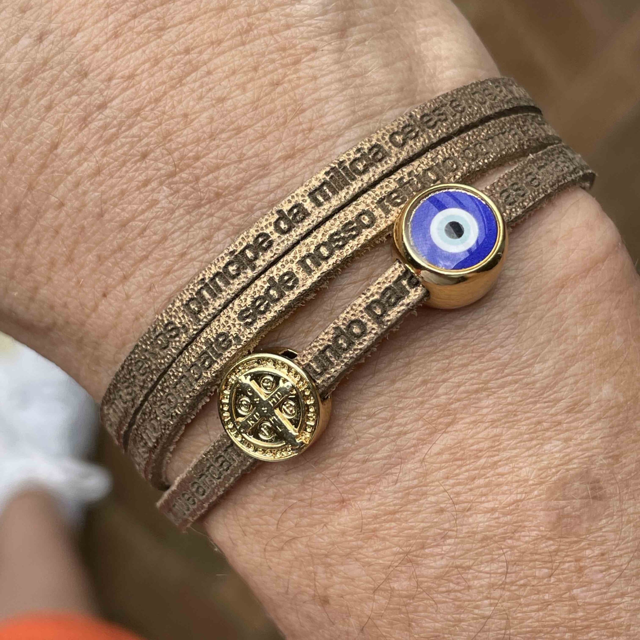 Para turbinar a proteção dois berloques: um de olho grego e uma medalha da Cruz Sagrada (de São Bento).