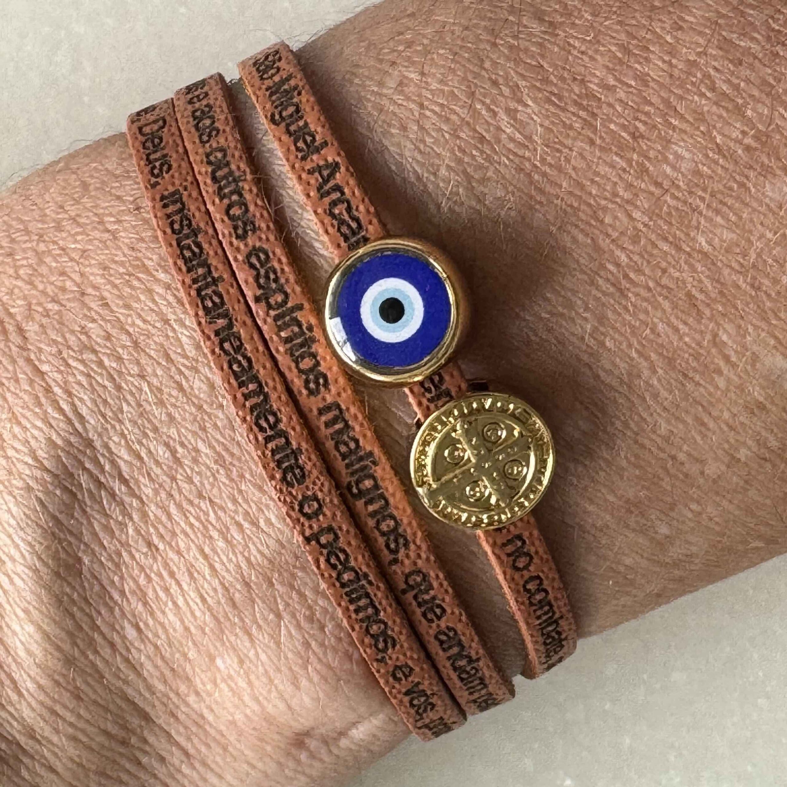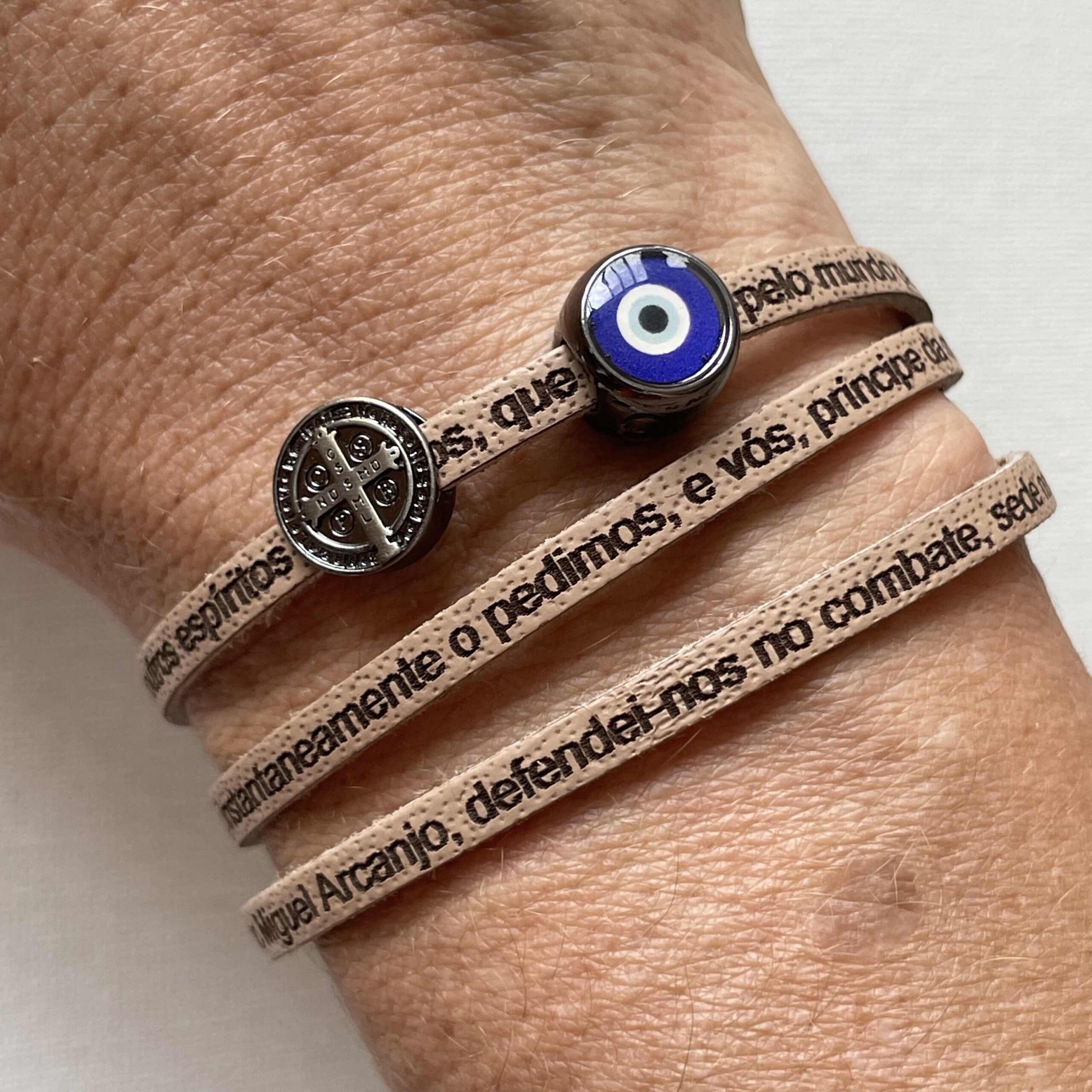 Pulseira de couro, com a oração de São Miguel gravada a laser.