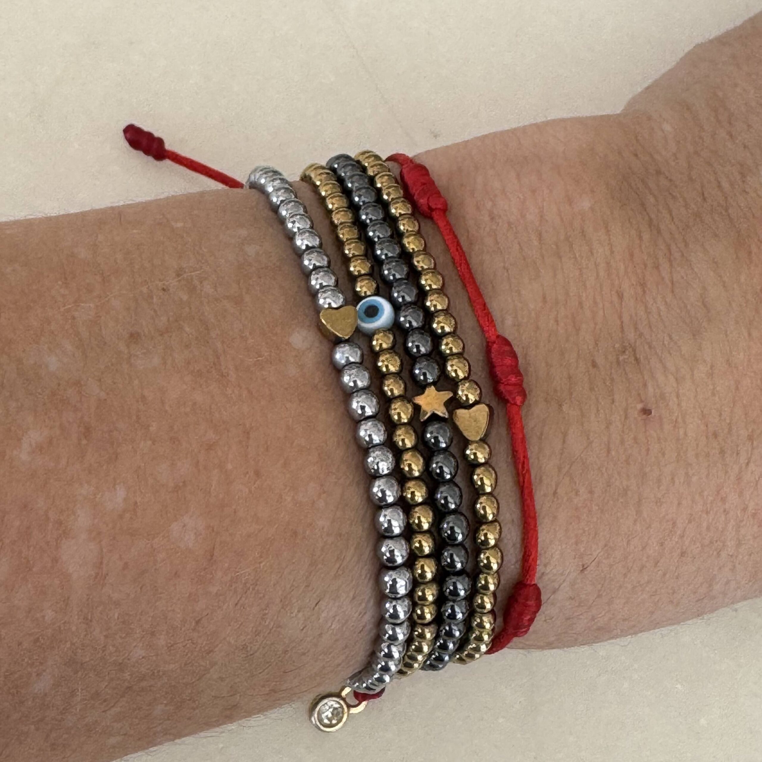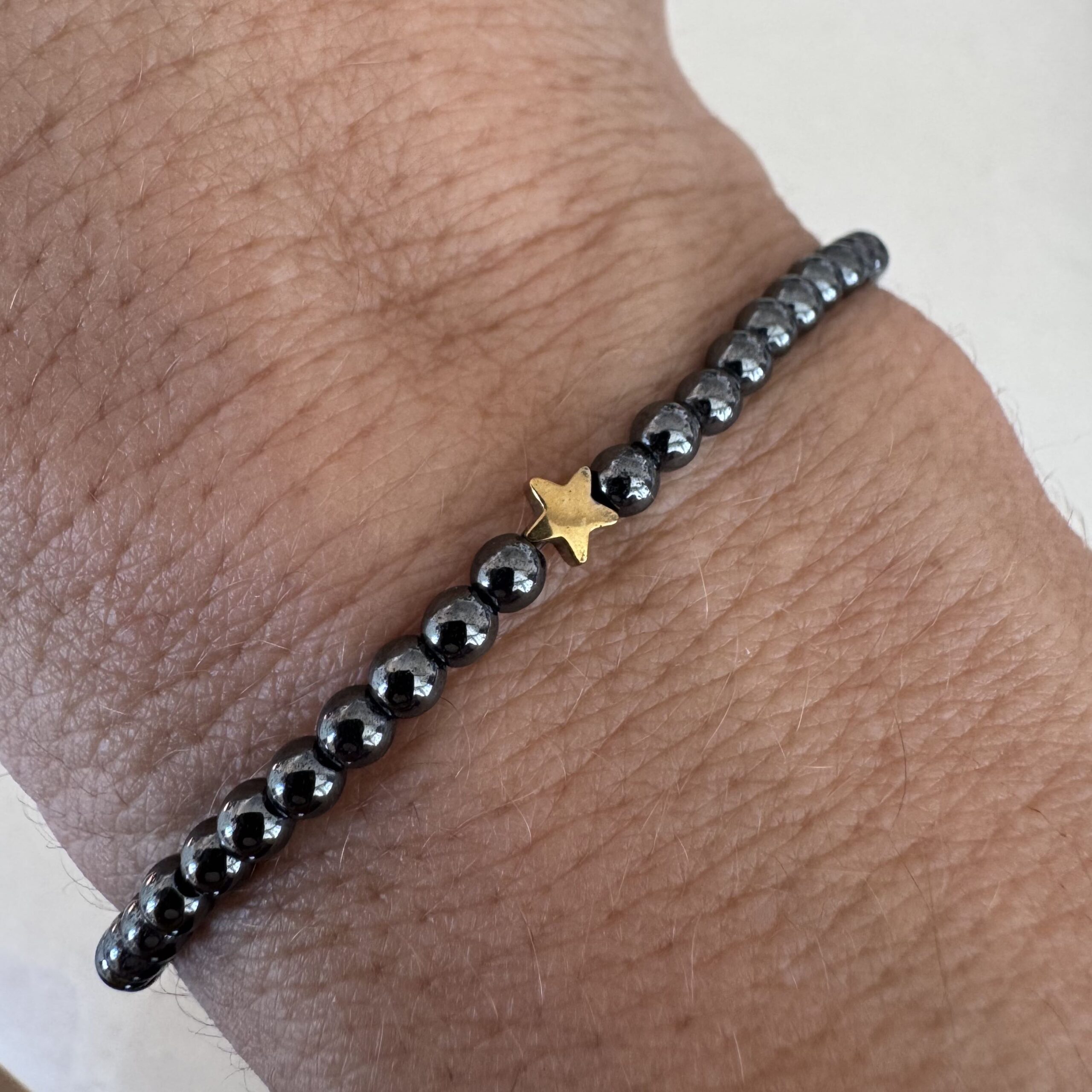 Pulseira feita em hematita grafite, com uma estrela também em hematita no banho dourado.
